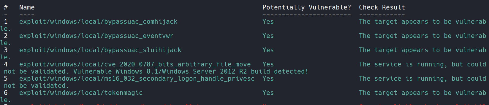 msf post(multi/recon/local_exploit_suggester) > runsession 1 correspond à l’ID de notre session meterpreter.